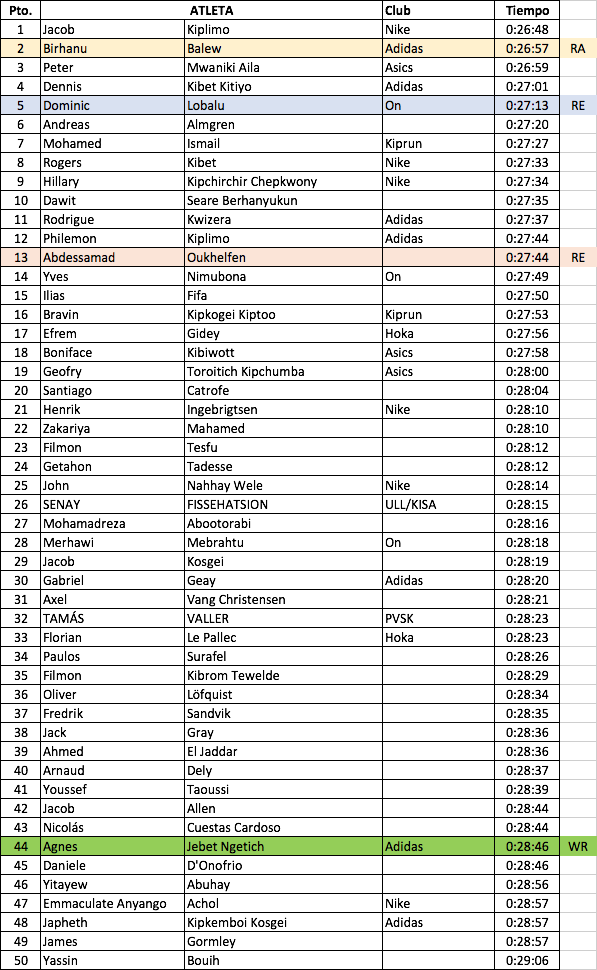 - El quinto, Dominic Lobalu (Suiza) igualó el récord de Europa del también suizo Julien Wanders (27:13) en esta misma carrera en 2020.