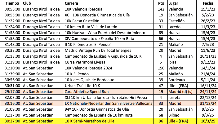 Su mejor marca (30:27) la hizo el pasado 16 de marzo el Lille. Tiene dos marcas mejores, pero son en circuitos con perfil descendente: Zara Athletics Speed Run Madrid 2024 (29:17) y San Silvestre Vallecana 2024 (30:16).